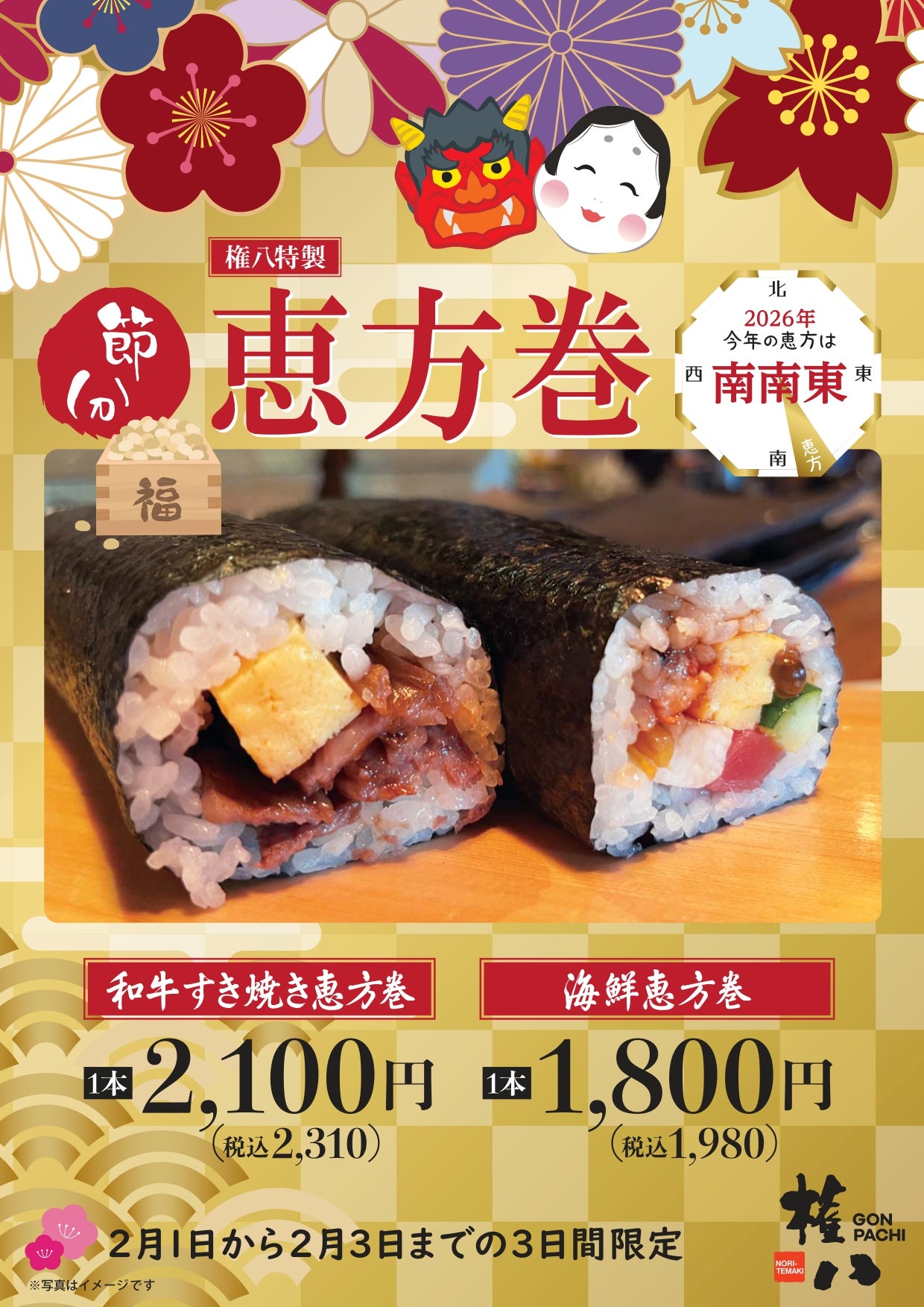 「海鮮恵方巻」と「和牛すき焼き恵方巻」の2種をご用意。2月1日~2月3日までの限定販売です。